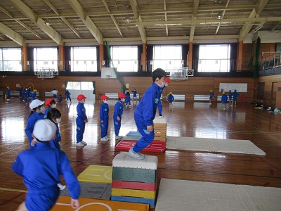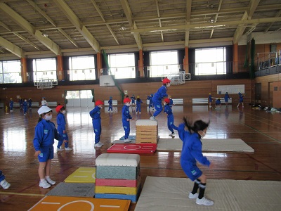 跳び箱を美しく跳ぶ練習をしています。手の付き方や跳び越える時の足の開き方などを確認しながら、低い段を跳んでいます。今よりさらに美しく跳べるように、これからも練習していきます。