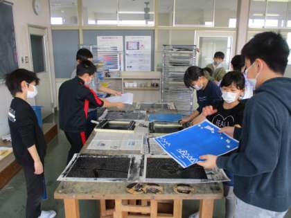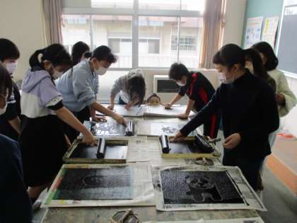 版画の作品を刷りました。何時間もかけて彫った板に色がついたり、紙にきれいに写し出したりできたことに達成感を感じていました。
