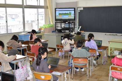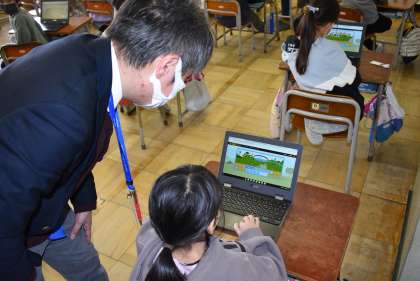 今日はICT支援員さんが来校され、プログラミング学習に挑戦しました。矢印のブロックを並べて、猿をゴールまで連れて行くプログラムを作ります。子供たちは「うまくゴールまで行けたよ」「あれ、これどうやってするんだろ?」と試行錯誤しながら、楽しく活動に取り組みました。