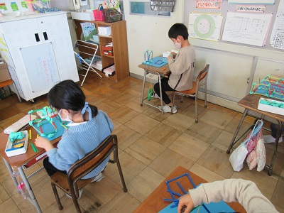 ひごと粘土を使って、箱の形を作りました。ひごや頂点になる粘土がいくつあれば箱の形ができるのか考えました。正方形だけの箱や長方形の箱など、2種類の箱を作ったことで、辺の長さも意識しながら組み立てました。