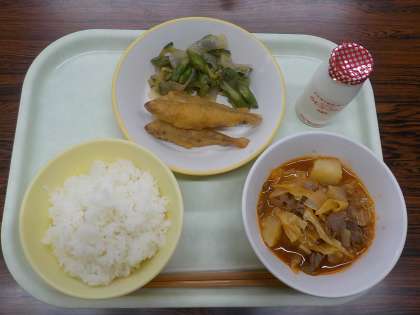 今日の献立は、ごはん、わかさぎのフリッター、こんにゃくサラダ、ボルシチ、飲むヨーグルトでした。