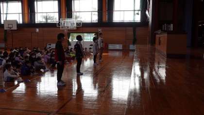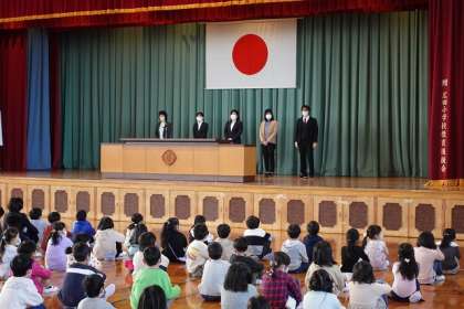 挨拶される職員のみなさんのあいさつを聞きました。6年生は、広田小学校や広田っ子のよさを元気いっぱい紹介しました。