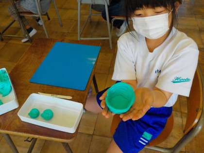 粘土をひも状に伸ばして底の周りに積み上げていき、入れ物を作りました。粘土を巻き付けながら、自分のイメージした入れ物ができあがっていくのがおもしろいようで、子供たちはとても楽しそうに作っていました。
