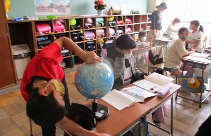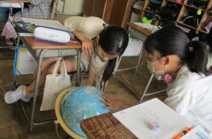 地球儀を使って、世界の様子について考えています。