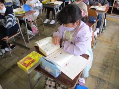 漢字辞典を使って、音訓索引の引き方の練習をしました。子供たちは、国語辞典とは違う引き方に始めは戸惑っていましたが、少しずつこつをつかんで早く引けるようになってきました。