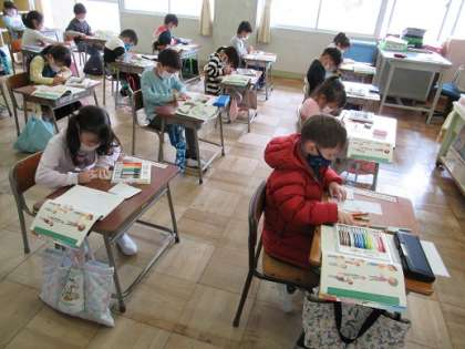 国語科の学習では、自分の名前を書いて、友達に「よろしくお願いします」と言い、オリジナルの名刺を渡しました。最初は恥ずかしそうにしていた子供たちでしたが、自己紹介をきっかけに打ち解けて笑顔で会話を楽しんでいました。