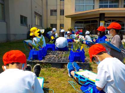 子供たちは、「花びらは6枚で、つるつるしているよ」「茎は、鉛筆くらいの太さだ」と1年生の時に学習した観察の方法を思い出しながら、詳しく観察カードを書いていました。