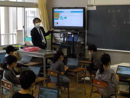 ICT支援員さんが来校され、プログラミングの学習を行いました。「アングリーバード」というソフトを使い、鳥のキャラクターを「前に進む」「右を向く」などの行動パーツを組み合わせてゴールに導きました。子供たちは「左だと進めないから右を向かせればいいだ」「あと二つ前に進むのパーツを入れてみよう」と試行錯誤しながら、意欲的に学習に取り組んでいました。