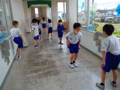 2年生の教室の横には、後館へつながる長い廊下があります。雨の日や朝の自主活動の時間は、この廊下で縄跳びや長縄跳びをして、体力つくりをしています。