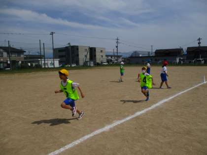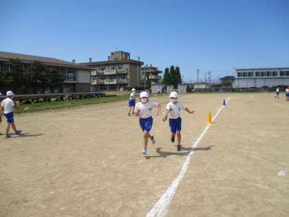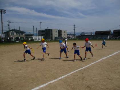 後ろを振り返らず、スピードに乗ってバトンパスをしようと繰り返し取り組んでいます。