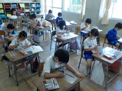 子供たちは容器の場所によって色を塗り分けたり、ハートや星などの模様を描いてみたりするなど、工夫しながら取り組みました。実際に光に当ててどんな模様になるのか、とても楽しみです。