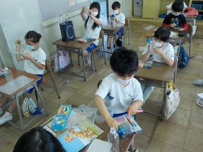 図画工作科「ひかりのプレゼント」では、ペットボトルやカップなどの透明な容器に色を塗り、それを光にかざして反射した模様を楽しみます。