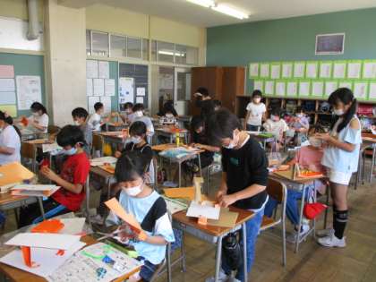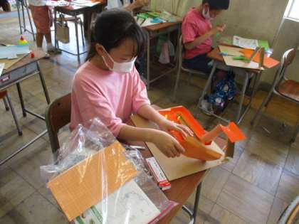 図画工作科の学習では、ビー玉を転がすコースづくりに取り組んでいます。みんなが転がしたくなるコースにしようと、試行錯誤しながら楽しんで製作しています。どんなコースができ上がるか楽しみです。