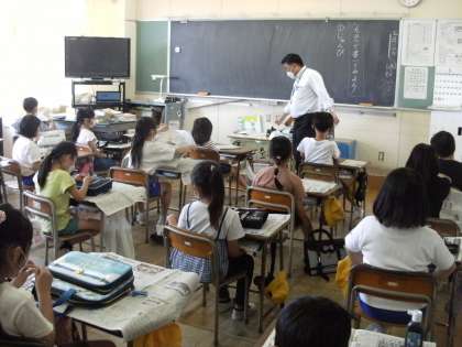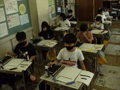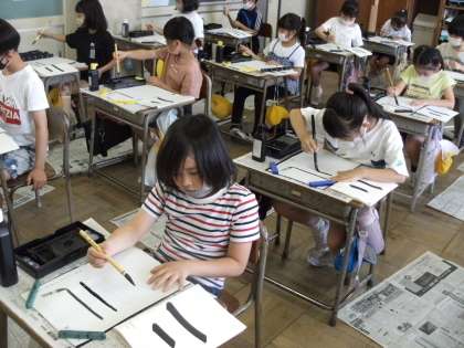 書写の学習の様子です。筆やすずり等の道具の使い方を学び、毛筆で「二」の文字を書きました。