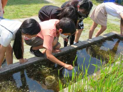 メダカの成長の様子を調べるため、観察池のメダカを育てることにしました。「子供のメダカはこんなに小さいんだ」と驚いていました。
