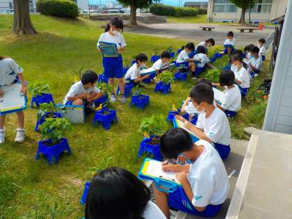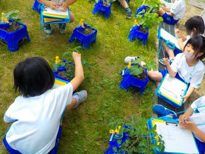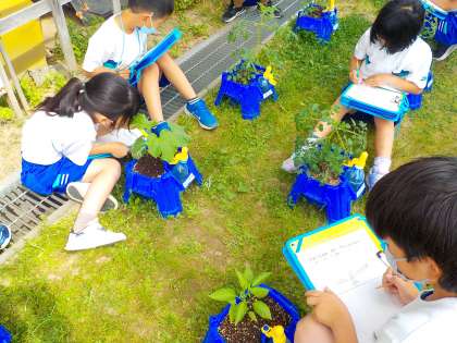 連休明けに植えた野菜が根付き、ぐんぐん生長しています。子供たちは、毎日水やりをして、生活科の時間には丁寧に観察しながら、生長を見守っています。「花が咲いたよ」「新しい葉っぱが出てきてるよ」など、うれしそうに話しています。