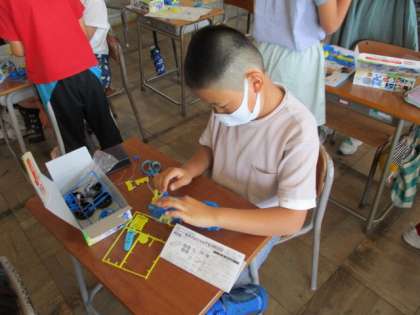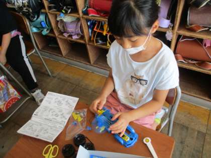 乾電池とプロペラ付きのモーターを導線でつなぎ、プロペラを回す装置を作りました。回すことに成功すると、「涼しい」とうれしそうな様子でした。その後、プロペラの回転の仕方が人によって違うことに気付き、何が原因か考えていました。