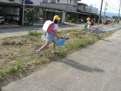 理科の学習で育てているホウセンカや、学年で育てている花に水をやっている様子です。「ホウセンカの子葉が出てきた」「休み時間に水をやっていいですか」等の声から子供たちの意欲の高まりを感じます。