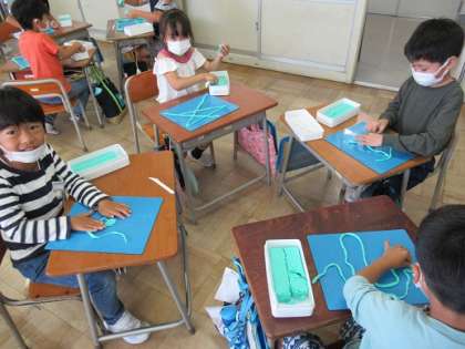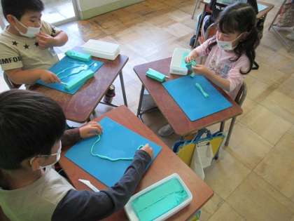 初めて粘土を使って学習しました。粘土をできるだけ長く伸ばし、いろいろな形に粘土板に広げて楽しみました。友達の作品を見て、「かたつむりみたいな形にしていておもしろいね」と友達の作品のよいところを伝え合い、関わり合いを楽しみながら活動しました。