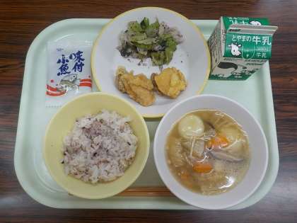 今日の献立は 雑穀入りごはん 鶏肉のから揚げ ゆかり和え すいとん 味付け小魚でした。