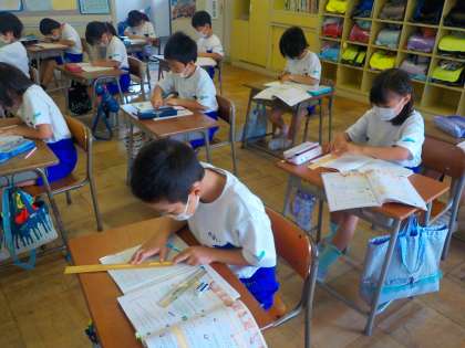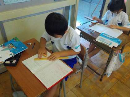 これまでも、ものさしを使って線を引いてきた子供たちですが、今日は「10cmの線を引く」という課題に取り組みました。10cmを計り、竹ものさしをしっかり押さえて、点と点を直線できちんとつなぐことを意識して、縦、横、斜めなど、いろいろな傾きの線を意欲的に引いていました。