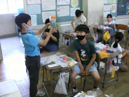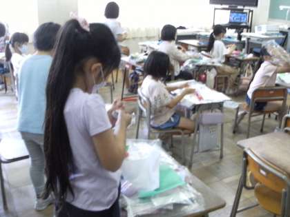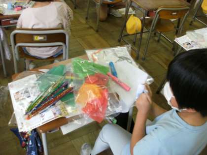 図画工作科の学習の様子です。たくさんの材料を使って自分にとっての友達をイメージした立体作品を作りました。材料の組み合わせや色使いを考え、工夫しました。