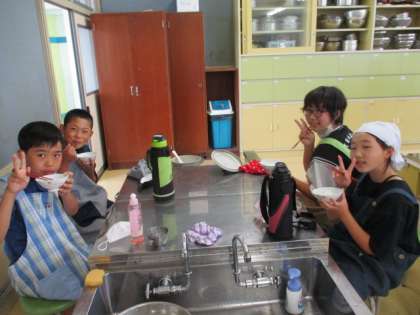 家庭科の学習では、日常食であるご飯を鍋で炊きました。水の量や火加減に気を付けながら班で協力をして作ることができました。子供たちは、「火加減を調節することが難しかった。」「共体験学習で今日の経験を生かしていきたい。」などと振り返っていました。