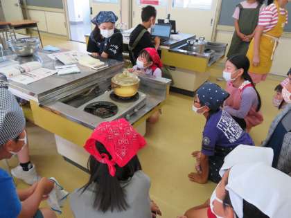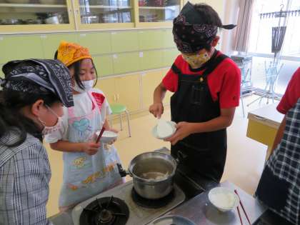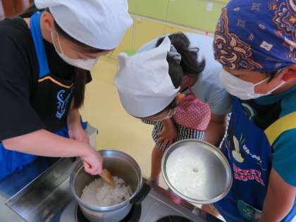 透明な鍋でお米がどのように炊けるのか観察しながら実習を行いました。