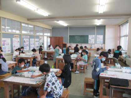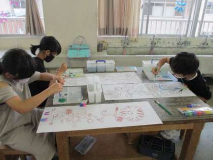 図画工作科の学習で、まぼろしの花を描いています。縦につないだ画用紙を使って、種からくき、葉、花へと生長していくように表しました。友達と相談したり作品を見せ合ったりして、形や色づかいを工夫しながら楽しんで制作しました。
