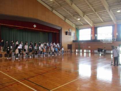 ケーブルテレビ富山さんが「学び舎のうた」の撮影に来校されました。6年生が広田小学校の代表として、校歌を歌ったり、学校の自慢や伝統などを伝えたりました。校歌の練習にも力を入れ、明るくて元気な歌声が体育館に広がりました。「テレビを見ている人に、広田の校歌やよさを知ってもらいたいな」「校歌の意味が伝わったらいいな」など、目的をもって収録に参加していた6年生。また、機材の様子や収録の仕方、進め方など、放送局の方の仕事ぶりを熱心に見たり聞いたりして、情報の学習にもなったようです。放送日が今から楽しみです。