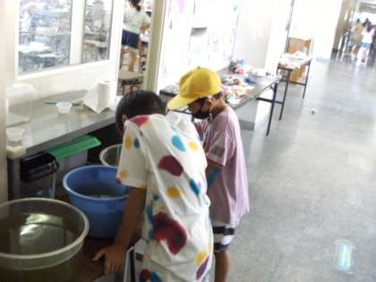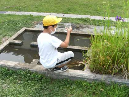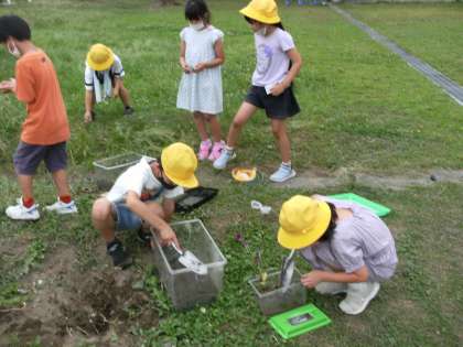 総合の学習の様子です。チョウやヤゴのために餌をとってあげたり、虫かごの中を整えたりしています。
