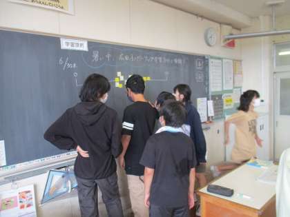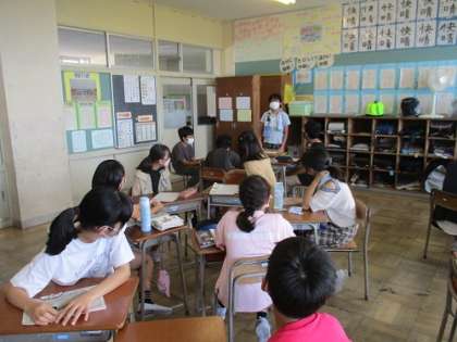 6年1組では、学び合いタイムで「暑い中、家庭学習の調子はどう?」について聴き合いました。順調に学習できている人もいれば、なかなかうまく進まない人もいて、仲間がどのように取り組んでいるのか、カードを互いに見合ったり、話を聞いたりしていました。「苦手な学習をする前後に好きな読書をして、自分の気持ちを高めている」「野球との両立は難しいけれど、自分のために野球の前に少しやり、終わったあとにもがんばってやっている」など、それぞれの取り組み方法を知りました。