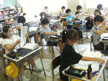 書写の学習の様子です。「日」の「おれ」の部分の筆遣いを中心に練習しました。