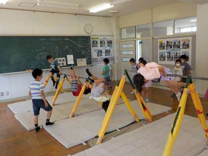 鉄棒を練習する部屋に、エアコンが設置されました。大休憩になると、早速たくさんの子供たちが訪れ、いろんな技の練習に取り組んでいました。暑い中でも快適になり、子供たちは運動を楽しんでいました。
