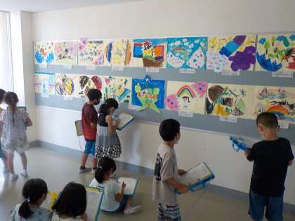 図画工作科「ふしぎな たまご」の鑑賞を行いました。色の塗り方や卵の切り方に着目して、友達の作品のいいねをたくさん探してワークシートに書きました。「卵から羽が生えてるなんてすごい」「三角形の形の卵っておもしろいね」「七色の虹の卵がとてもきれいでした」と、色と形の面白さを感じながら、感じたことを相手に伝えていました。