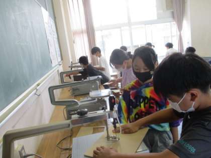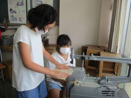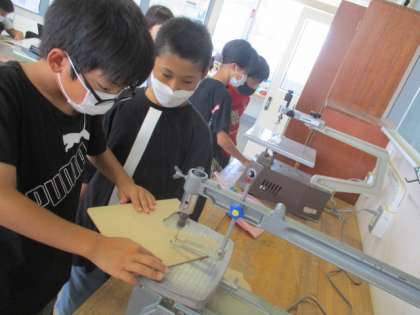 図画工作科では、糸のこぎりを使って板を切り、パズルづくりをしています。初めて使う糸のこぎりでしたが、刃の正しい付け方や外し方をしっかりと確認し、製作を進めることができました。
