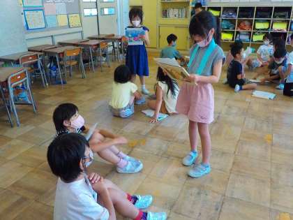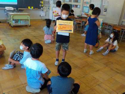 これまでに読んだ本の中から、お気に入りを一冊選び、友達に紹介しました。メモをもとにどんなお話かを話し、そのお話の好きな所を、本を見せながら紹介しました。