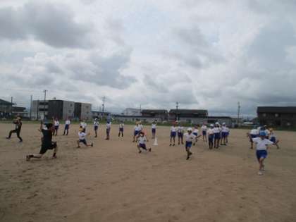 今日は、走り幅跳びの練習をしました。「跳んでいる時に、手を使って空中で大きく前へ前へと動かすぞ」「踏み切りの力はどれくらい強くしたらいいかな」など、仲間と模索しながら練習を進めています。
