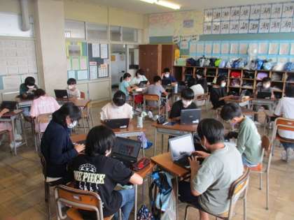 また、教室では「1学期の振り返り」を行いました。クロムブックにあるジャムボードを使い、1学期学級で伸びたところやもっとがんばっていきたいところを出し合い、2学期へのパワーにしていきました。