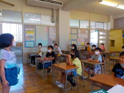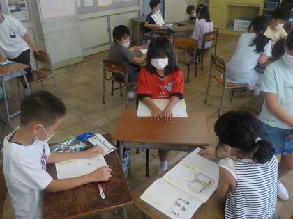 夏休みが終わり、元気な子供たちが教室に帰ってきました。子供たちは夏休みの思い出を友達に話したり、夏休みの作品を見せ合ったりしています。