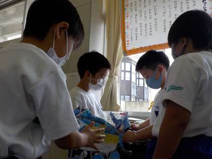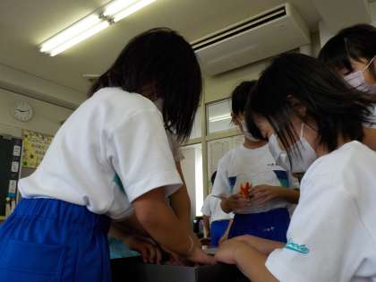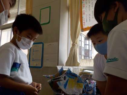 お店屋さんとお客さんになって作品を紹介し合っています。「すごい!」「きれい」とつぶやく声が聞こえてきました。