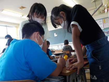 この中に4つの合同な図形があります。見つけよう。「こうじゃない?」「これしか思いつかない」悩んでいる割には何だか楽しそうです。