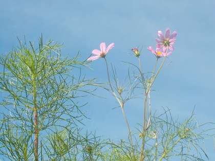 コスモスの花が風に揺れていました。青い空に映えます。これから多くの皆さんの目を楽しませてくれることでしょう。