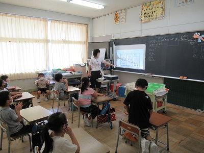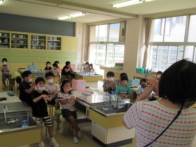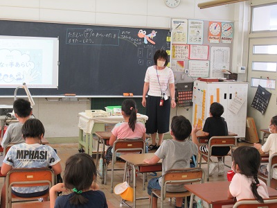 学級活動では、養護教諭の濱谷先生と手洗いの大切さ学びました。