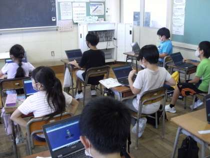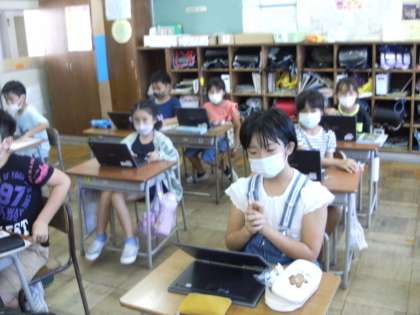 外国語活動の学習の様子です。英単語の意味を4択から選ぶ問題に挑戦しました。happyやsadなど、感情を表す言葉の意味を理解しました。