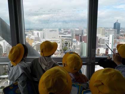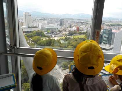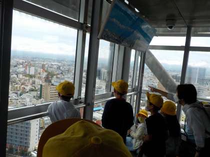 富山市役所展望塔を見学した様子です。富山湾が北にあることを確認した後、東西南北それぞれの方位に何があるのかを見学しました。