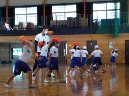 1,2年生の子供たちが富山市の専門家からボールの投げ方の基本を教えてもらいました。