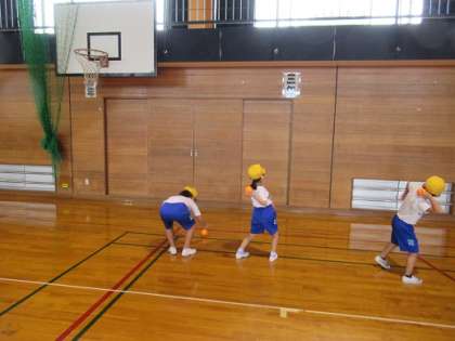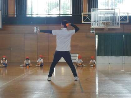 握り方が上手になった子供たちは、次に投げる練習しました。ボールを上に投げて拍手をしてキャッチしたり、体の下半身から上半身につながるように投げたりする練習をしました。