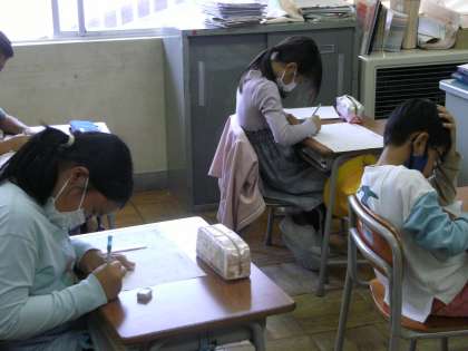 算数の学習の様子です。かけ算の筆算を解きながら、桁が大きくなってもやり方が同じことを理解しました。