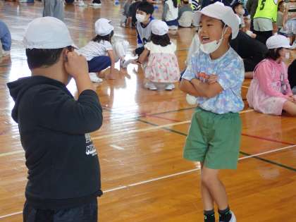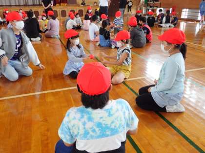 初めての全校集会がありました。縦割り班でのゲームに笑顔がいっぱいの1年生でした。